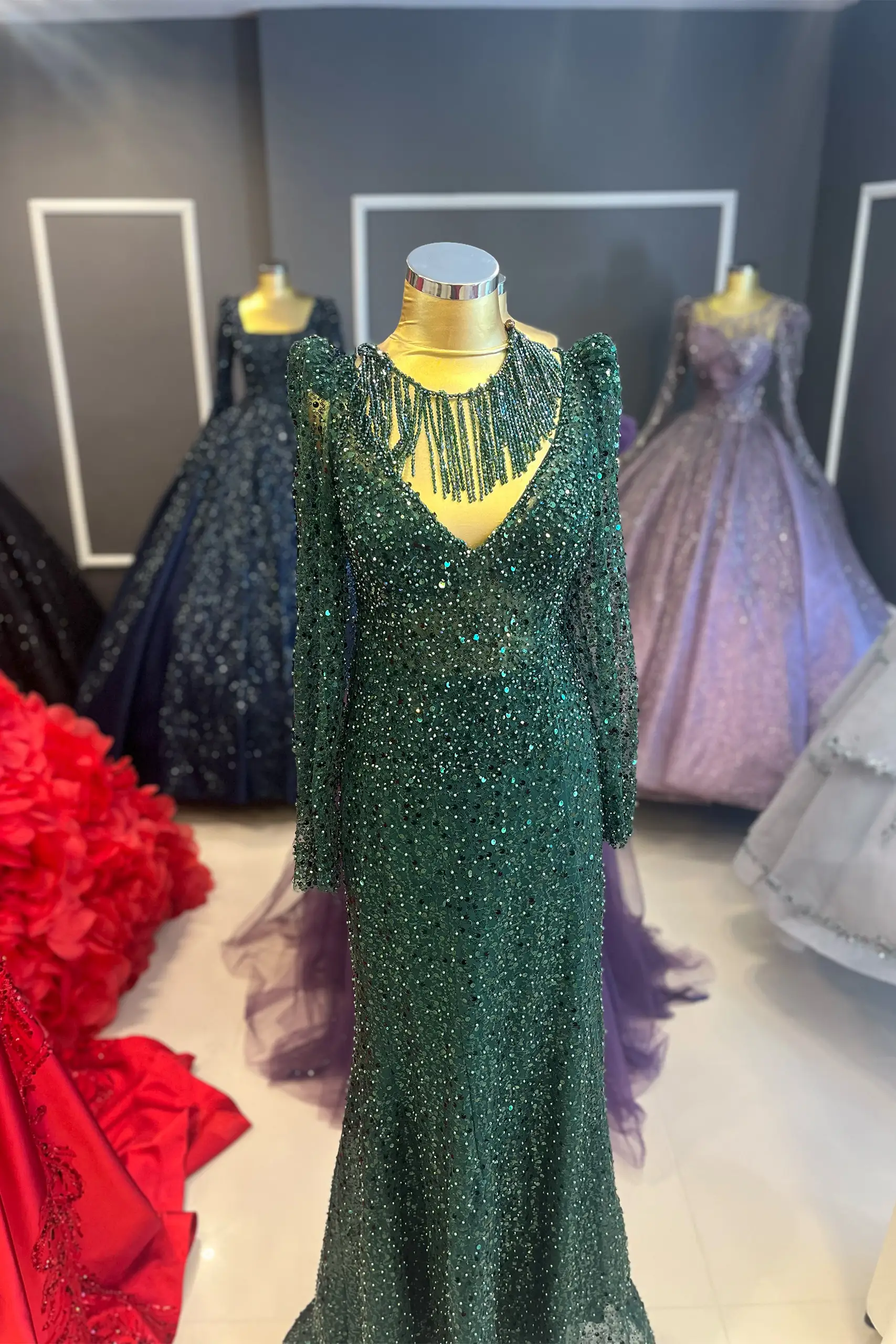 Püskül Boyunluklu Uzun Kollu Abiye Nişanlık